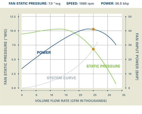 Como ejemplo, un ventilador dimensionado para entregar 25,000 pies cúbicos por minuto (CFM) a 10 pulgadas de presión estática de columna de agua (10” wg) usará 49.8 BHP a 1853 revoluciones por minuto (RPM).