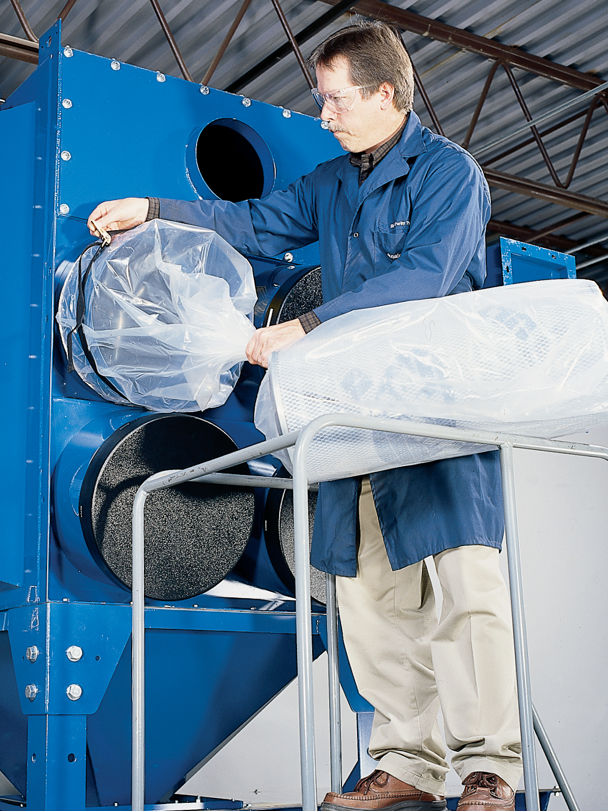 Figure 5 - Le système Bag-In/Bag-Out (BIBO) améliore le remplacement des filtres et l'entretien de l'évacuation de la trémie afin de minimiser l'exposition des travailleurs à des poussières potentiellement nocives et de réduire l'exposition des contaminants à l'atmosphère. Figure 5 - Le système Bag-In/Bag-Out (BIBO) améliore le remplacement des filtres et l'entretien de l'évacuation de la trémie afin de minimiser l'exposition des travailleurs à des poussières potentiellement nocives et de réduire l'exposition des contaminants à l'atmosphère.