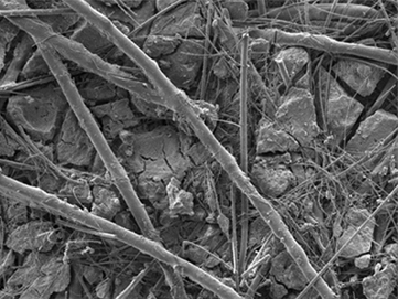 I setti filtranti dell'aria in ingresso sono stati tradizionalmente realizzati con fibre di cellulosa o con una miscela di fibre in cellulosa e sintetiche. Una tecnologia più recente come l'Ultra-Web® di Donaldson utilizza un setto filtrante in fibra sottile realizzato con un processo di elettrofilatura che produce una fibra sintetica continua e flessibile che varia da 0,2 a 0,3 micron di diametro. Ultra-Web forma uno strato sottile di fibre con spazi finissimi tra le fibre, che intrappolano la polvere sulla superficie dei setti filtranti, come mostrato nella Figura 4.