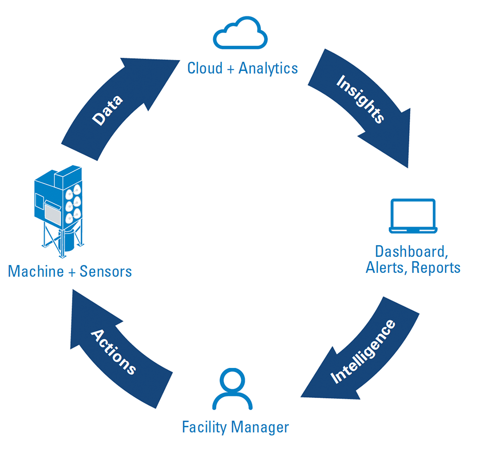 iCue™サービスを導入するために、技術者が集塵機の側面にセンサー内蔵のワイヤレスセルラーゲートウェイを設置します。このゲートウェイデバイスによって、施設の社内自動化システムに接続することなく、センサーデータはウェブベースのアプリケーションに直接送信されます。このシステムはITによる統合が必要ないため、簡単に導入できます。