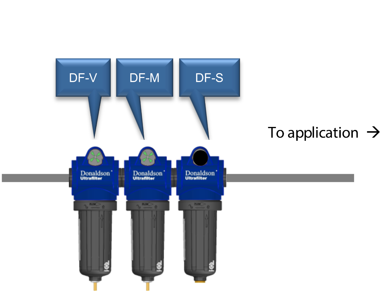 - DF-Sコアレッシングフィルターエレメント(0.01ミクロンで99.99998%の効率):年に一度または差圧計に差圧が表示された時に交換します。