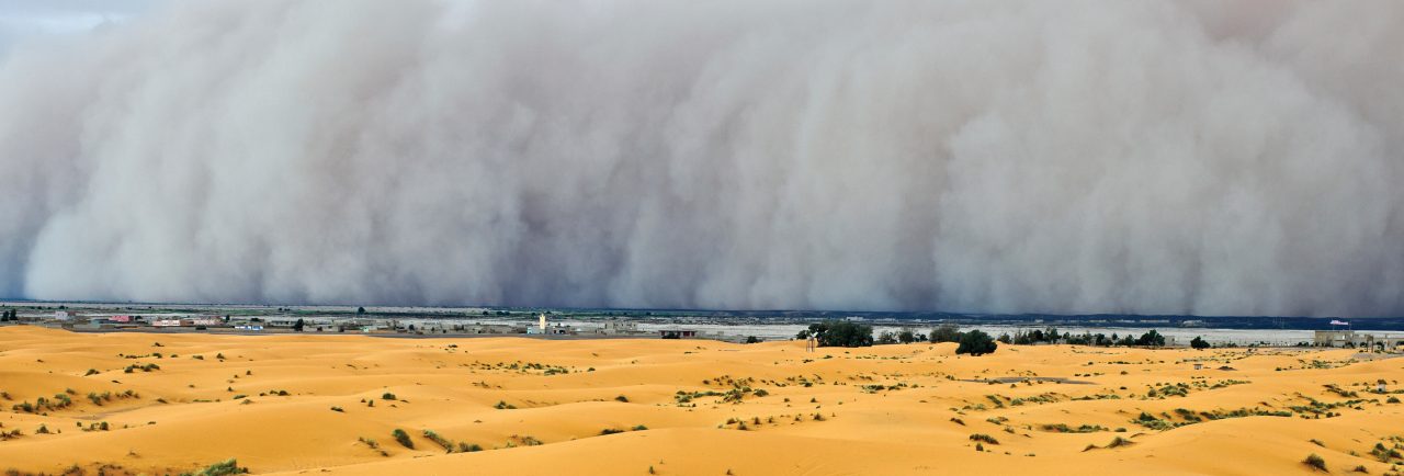 砂塵嵐や砂嵐と呼ばれる気象現象は、細かいバラバラの土が強風で大量に巻き上がり、大気中に吹き上げて粒子の密集した壁を形成することで発生します。砂嵐は数マイルにわたって成長し、高さは数千フィートに達することがあります。砂嵐は複雑であることに加え、塵埃粒子が小さくて軽いほど大気中に高く舞い上がり、遠くまで移動します。さらに、乾燥した気候であればあるほど、その地域は砂嵐の影響を受けやすくなります。