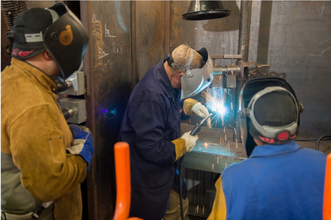 サンディエゴのWorkshops for Warriorsには、ソース抽出アームを備えた複数の溶接ステーションがあり、中央に設置したDonaldson Torit® Downflo®オーバル集塵機に接続されています。