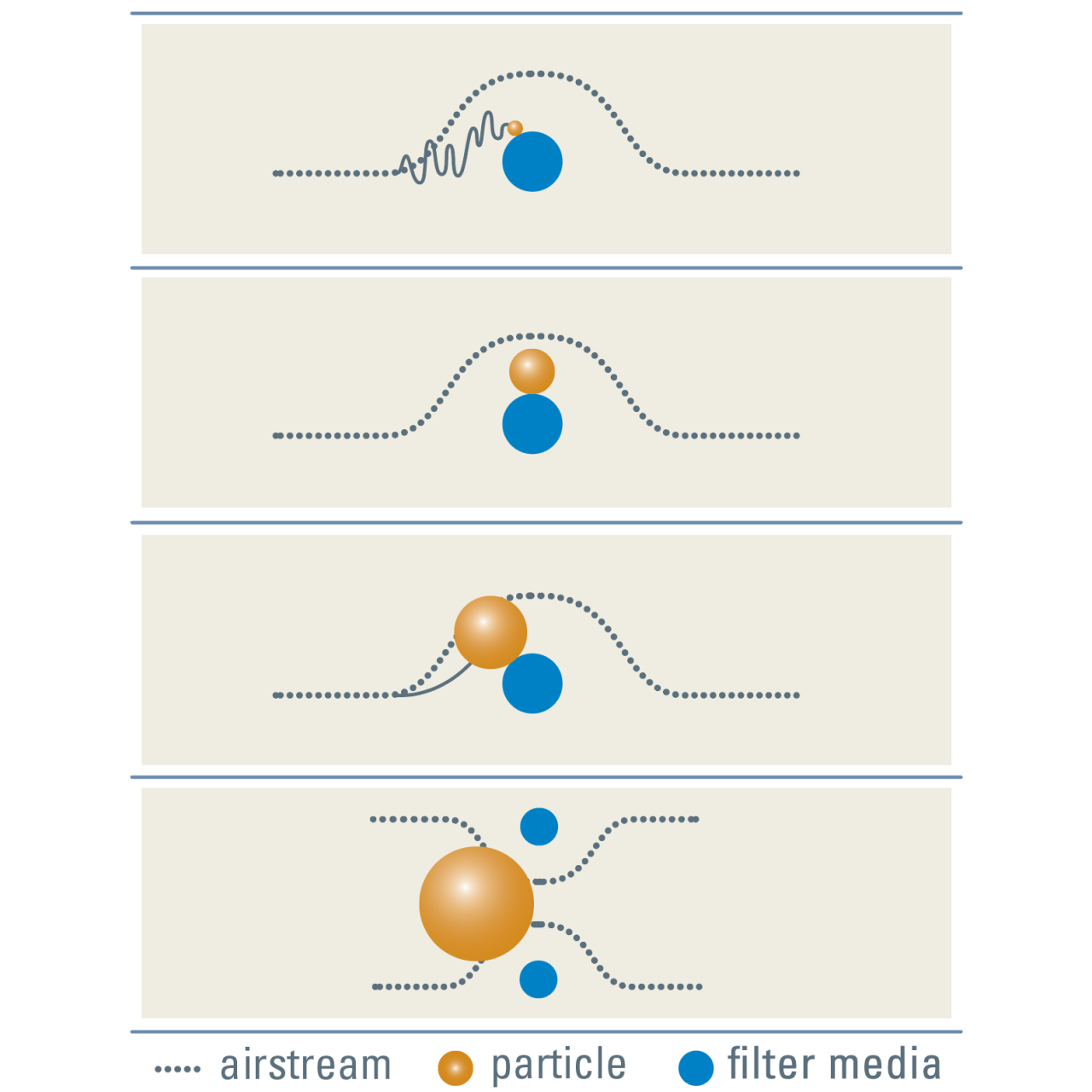 衝突は、フィルターを通過し流路の方向変化を維持できない、より大きな粒子に作用します。粒子の質量によって空気の方向が変わると、粒子は繊維に向かってまっすぐに飛んでいきます。