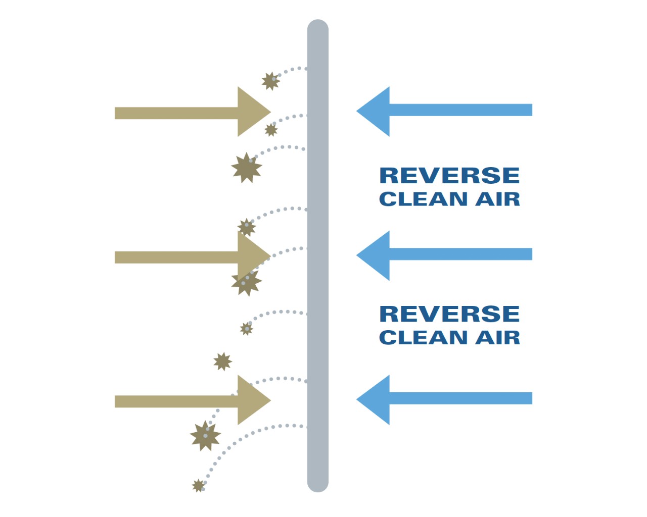 A limpeza por reversão de ar introduzia um fluxo de ar na direção oposta à do ar filtrado (Figura 3). O fluxo inverso de ar penetrava o elemento filtrante pelo lado limpo do filtro e derrubava a aglutinação de pó da superfície externa do filtro. Vários métodos foram utilizados para realizar o fluxo inverso, incluindo tanto ventiladores quanto ar comprimido.