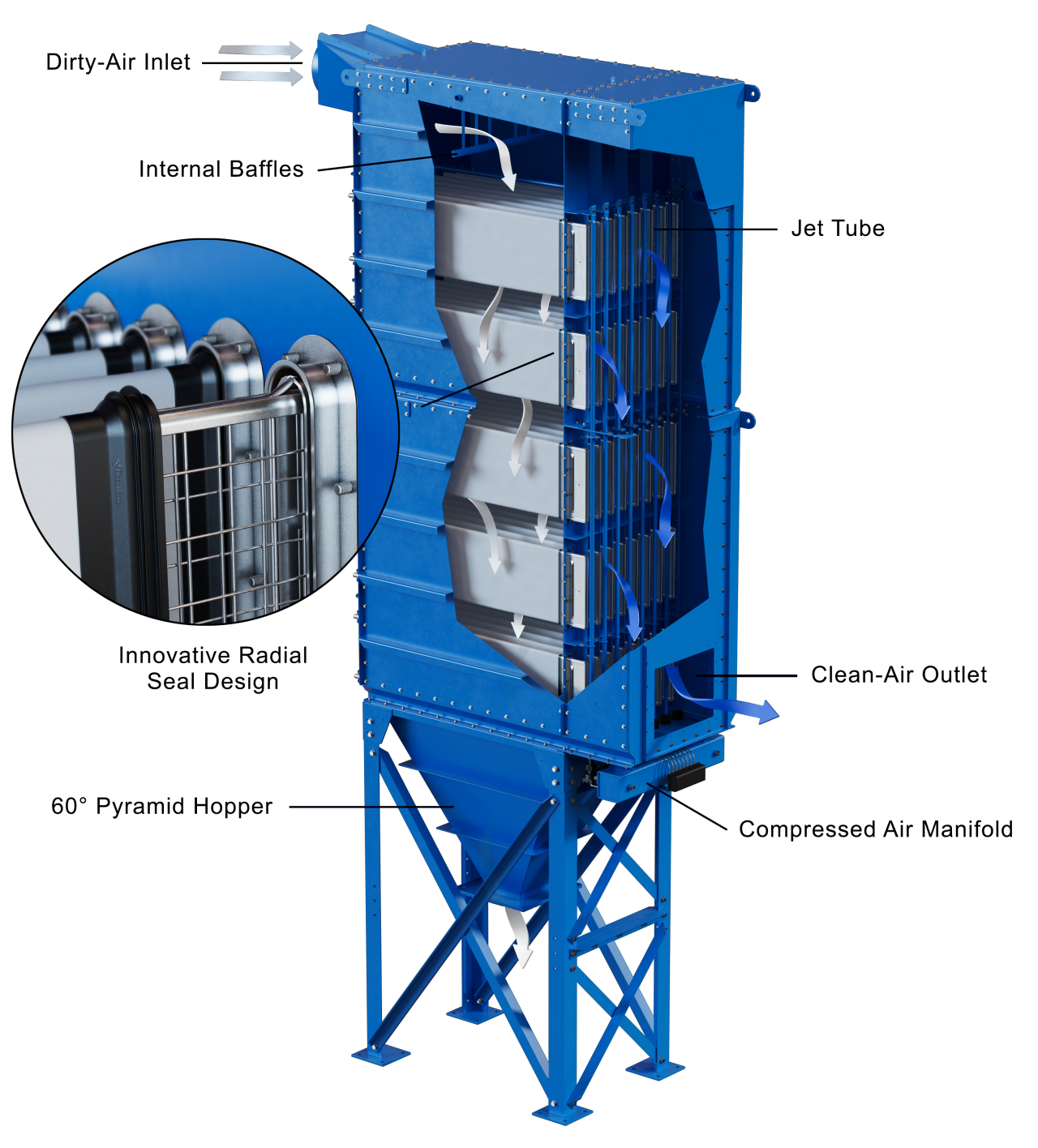 Нисходящий поток воздуха в DLMC G2 способствует опаданию материала, что обеспечивает снижение перепада давления и продление срока службы фильтров, способствуя снижению совокупной стоимости владения. Нисходящий поток воздуха в DLMC G2 способствует опаданию материала, что обеспечивает снижение перепада давления и продление срока службы фильтров, способствуя снижению совокупной стоимости владения.