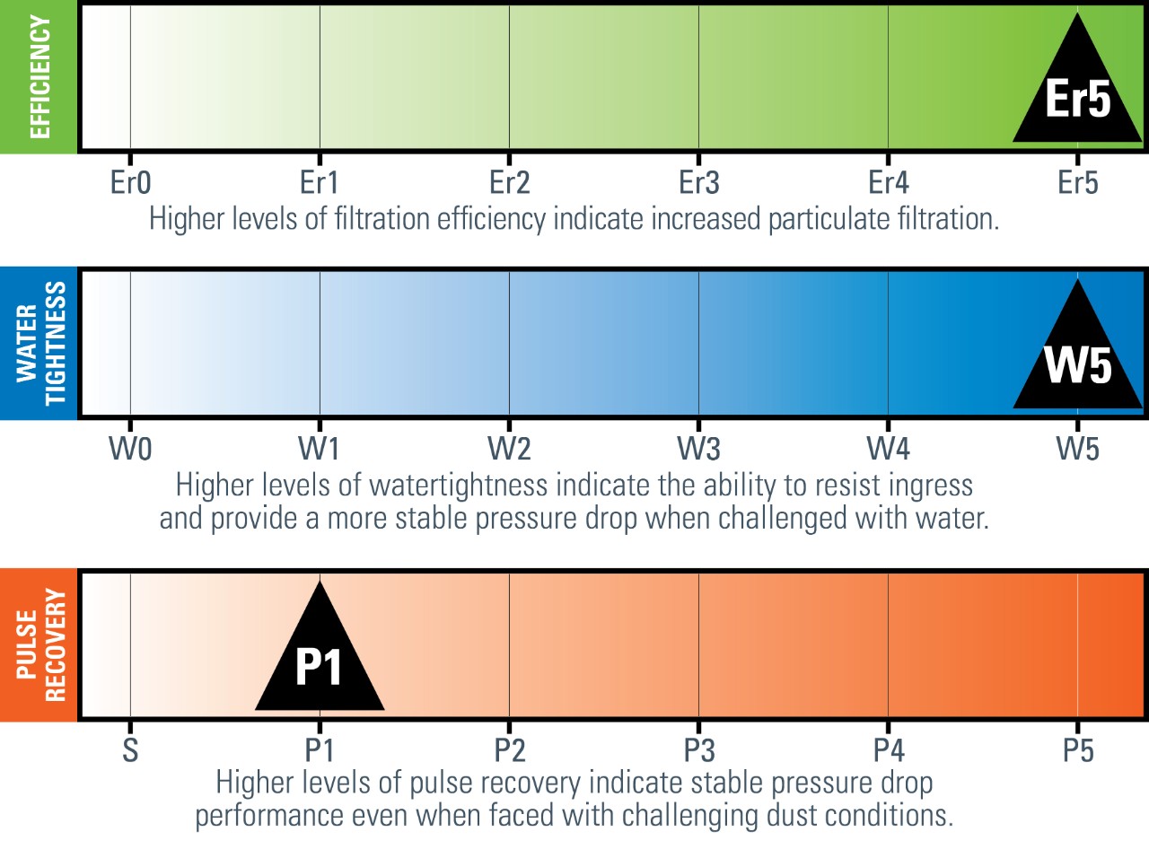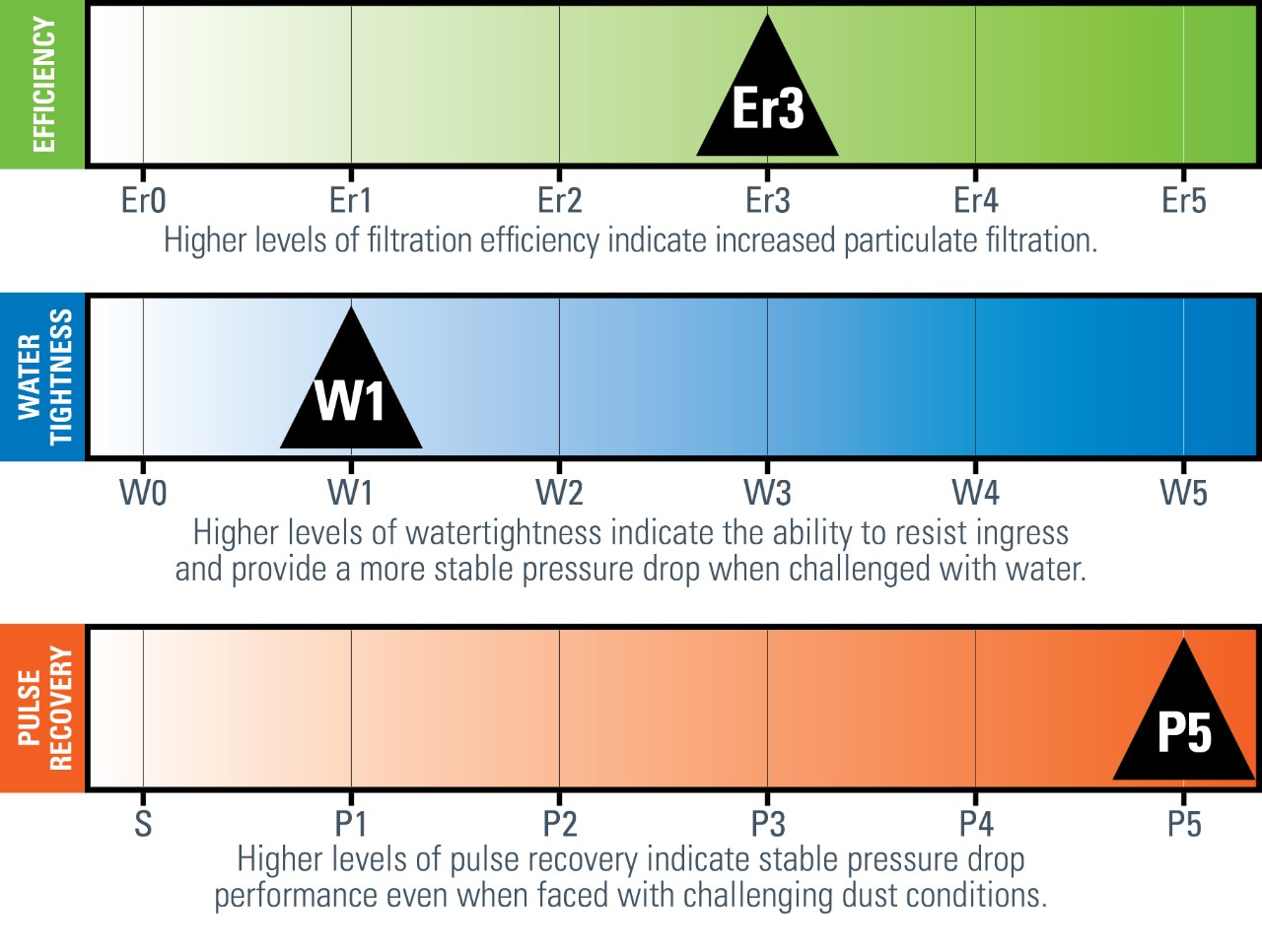 Используя базовый профиль текущего фильтра, владелец может выбрать сменные фильтры более высокой классификации, учитывая свойства, наиболее важные в новых условиях. Профиль Er|W|P позволяет сравнивать сравнимые вещи и более эффективно подбирать фильтры. Компания Donaldson применяет стандартизированное тестирование для определения показателей классификации Er|W|P по шкале от 0 до 5 как для текущего фильтра, так и для предлагаемого решения.