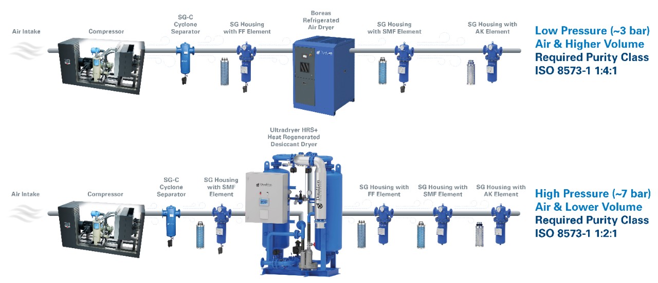 - 聚结和颗粒过滤器可捕获水分、油气溶胶和固体污染物,以保护成型、控制和自动化系统。